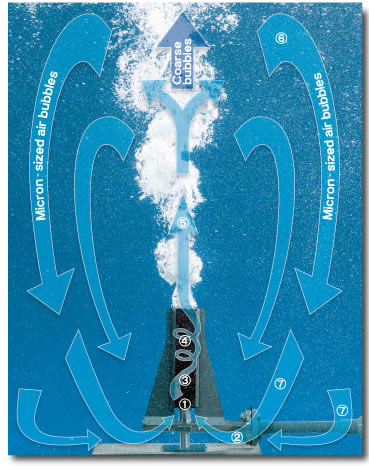 Intense circulating flow forces part of the fine bubbles and water back to the tank bottom, allowing bottom sludge to participate in circulation;